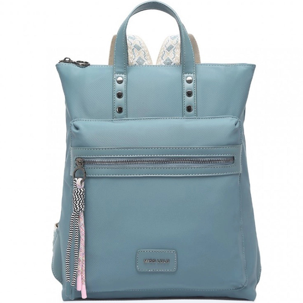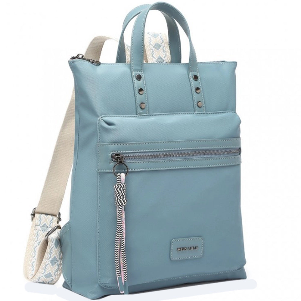 Fatada rucsacului este decorata cu un buzunar cu fermoar accentuat cu snururi decorative care servesc drept tragatori de fermoar elegant. Pe partea din fata a rucsacului se afla sigla MISS LULU, care adauga o nota speciala designului minimalist. Curelele de umar reglabile permit reglarea individuala, in timp ce curelele de mana din partea de sus sunt decorate cu trei nituri elegante pe fiecare parte care subliniaza caracterul urban al gentii.