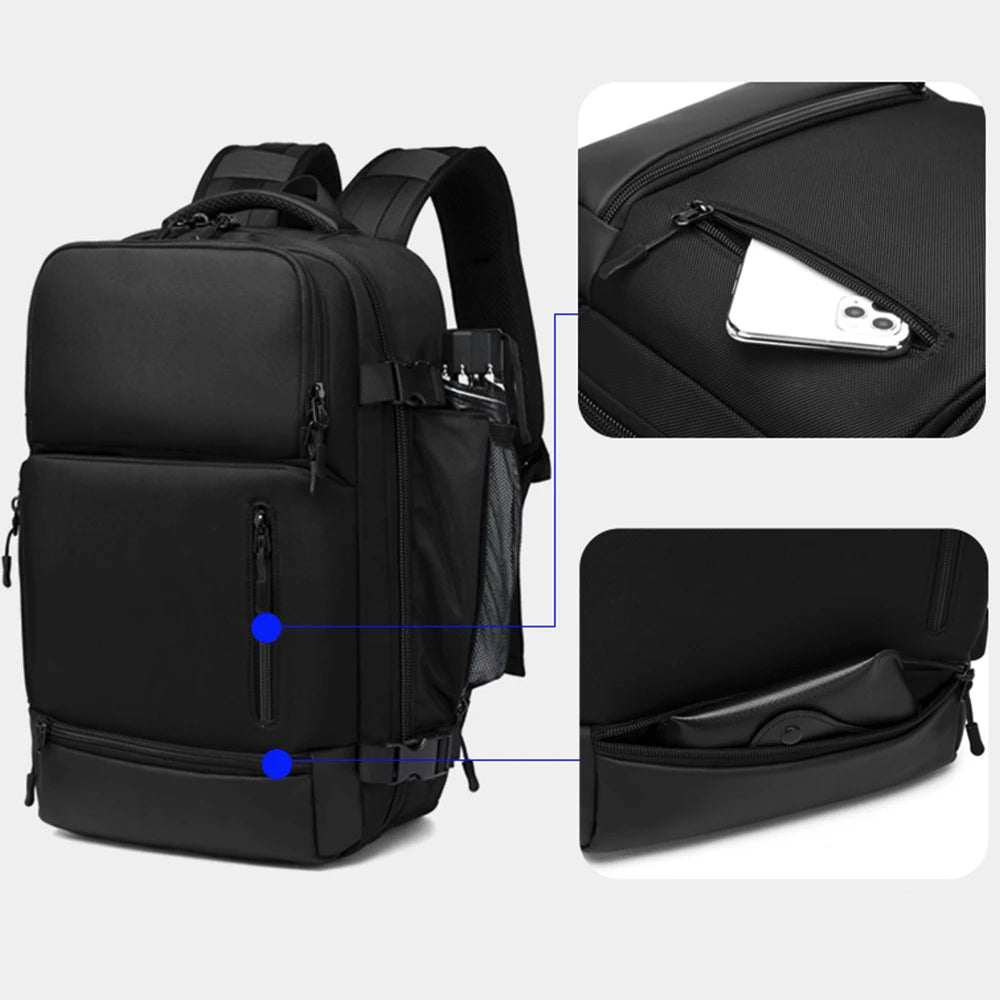 Rucsacul are doua barete late pentru confort maxim, reglabile in lungime, si o curea ajustabila pentru sustinere. Manerul pozitionat pe marginea superioara asigura transportul comod in diferite ocazii. Are o banda orizontala in partea din spate pentru fixarea sa pe troler si un buzunar ascuns inchis cu fermoar. In partea dreapta exista un port USB extern pentru reincarcarea rapida a gadgeturilor din mers.