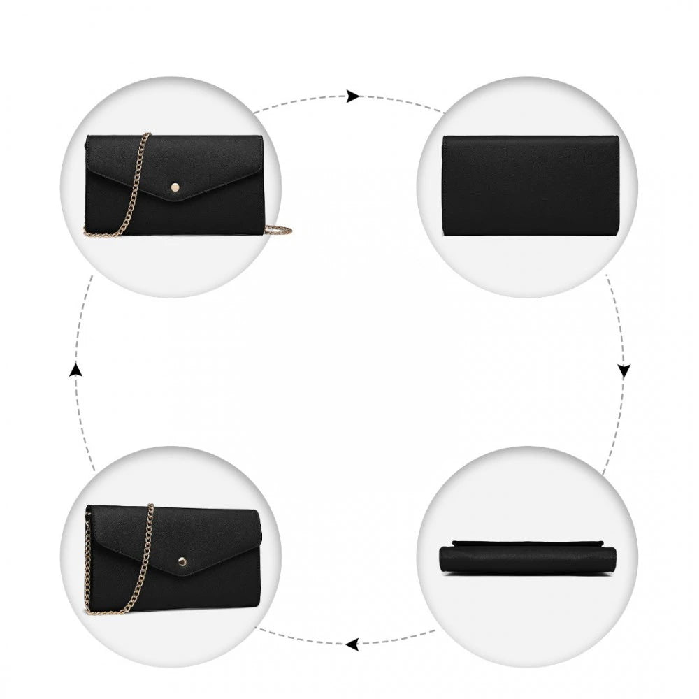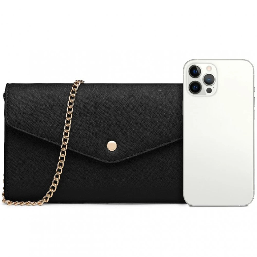 Geanta de tip crossbody are o curea de umar detasabila cu lant pe care o poti desprinde pentru a o folosi ca clutch. Accesul la geanta se face printr-o clapa cu inchidere magnetica, in interior exista un compartiment cu fermoar.
