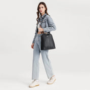 Designul unic cu elemente din piele confera gentii un aspect la moda atat pentru femei, cat si pentru fete.